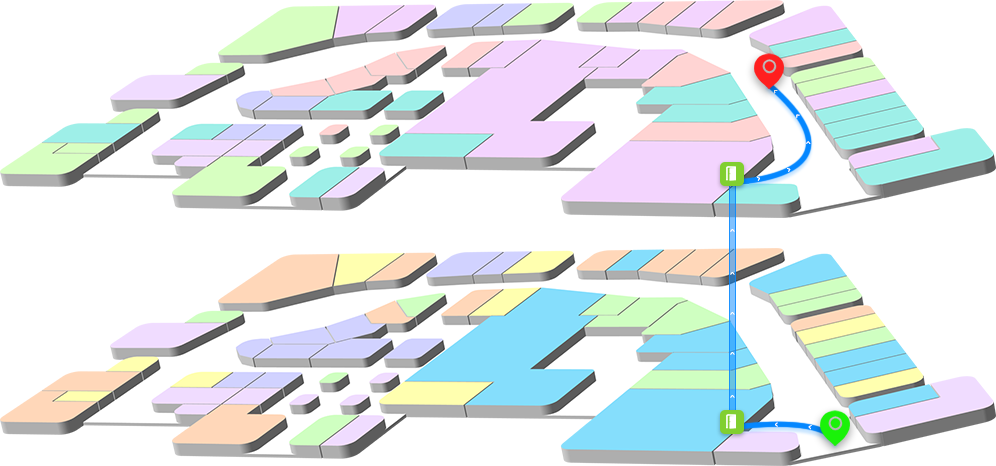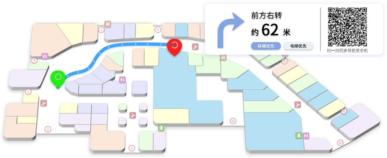 与室外地图不同,室内存在立体多楼层,且路径分布各层。在跨层方式上,不同使用者或场景存在不同诉求,因此我们对每个跨层节点定义了多属性。当然,默认推荐“距离最短跨层路径”综合策略,并支持多种方式切换